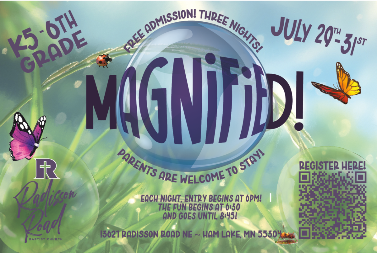 Join us for an exciting Vacation Bible Time at Radisson Road, "Magnified"! This summer, kids will dive into a faith-filled adventure, exploring God's greatness through fun activities, inspiring Bible stories, and meaningful friendships. From July 29th to July 31st, our program will spark joy and spiritual growth for children in K5 through sixth grade.